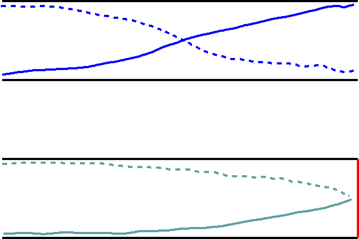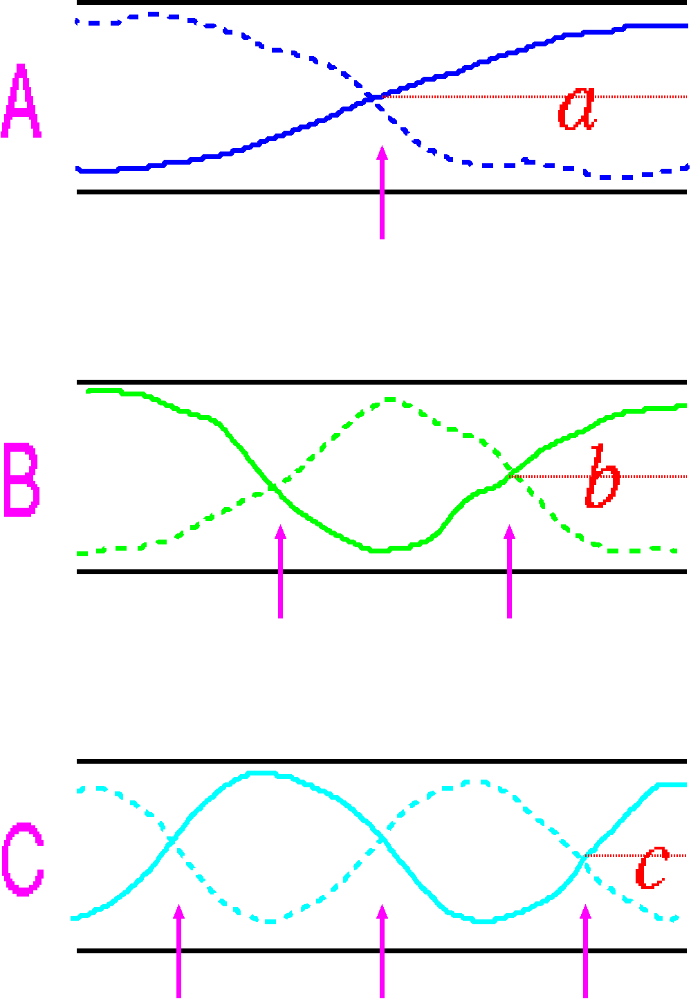 一番単純なのはAのような 振動です。 この振動では、 ある時には点線の状態だった空気が、 次には実線の状態になっています。 管の両端の空気は自由に振動し、 一方真ん中の部分(→)は時間が経っても動きません。 図のBのような 振動も可能です。 この振動では、管の両端や真ん中の空気は自由に振動しますが、 管の中に二ヶ所、 時間がたっても空気が振動しない場所(→)があります。